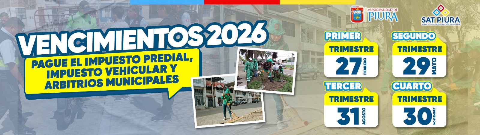 Fechas de vencimiento de las obligaciones tributarias de sus Tributos Municipales. Cumplir el pago oportuno, garantiza los principales servicios de limpieza pública, mantenimiento de parques, jardines y serenazgo.
